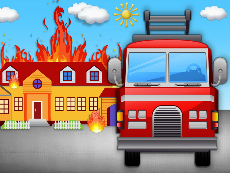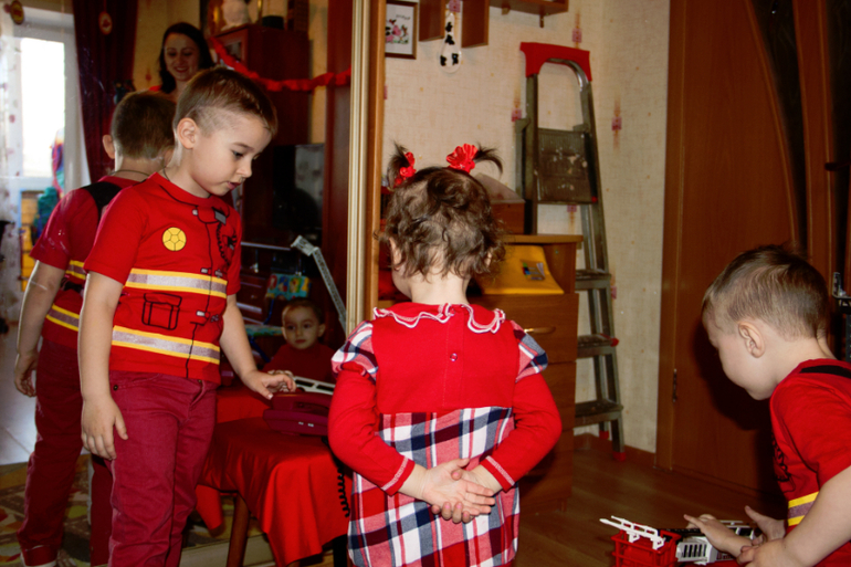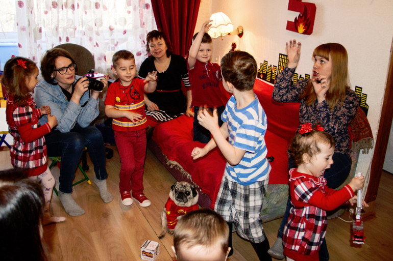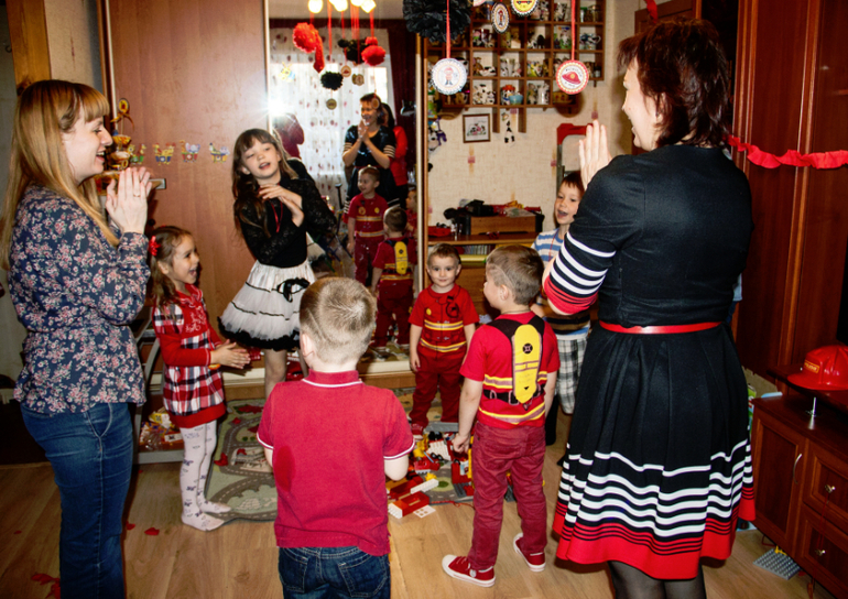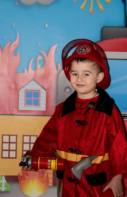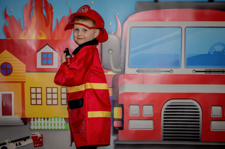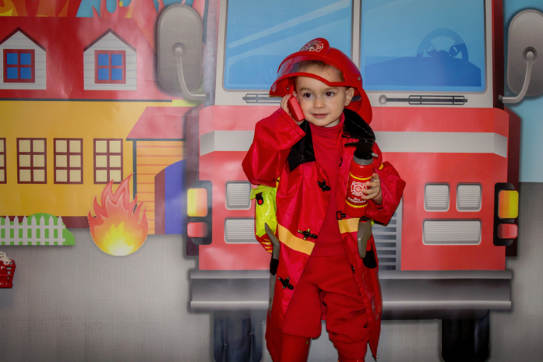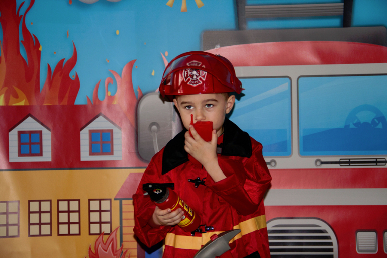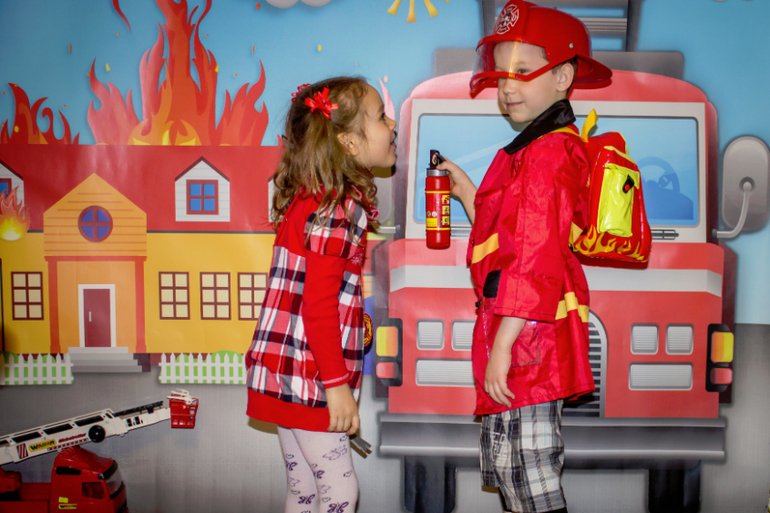 А потом деткам в костюме было предложено сфотографироваться возле машины и горящего дома на фотозоне