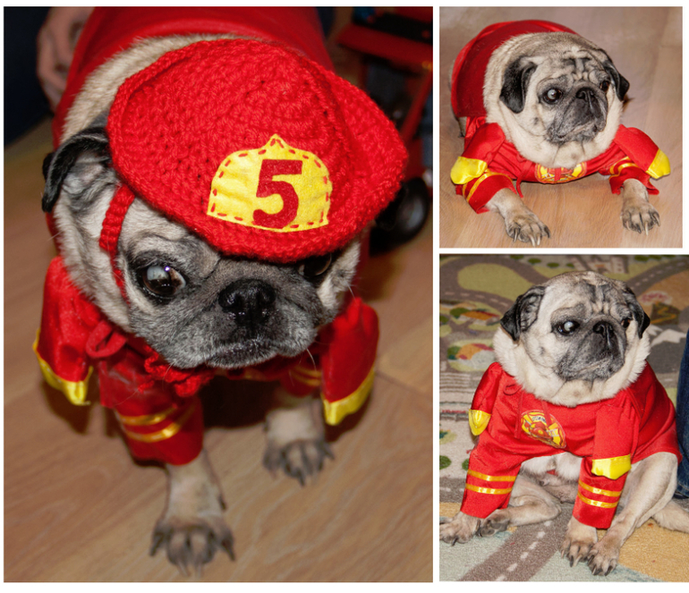Кстати, я даже для нашей собачки смастерила пожарный костюм. Каску связала крючком, а форму сшила из вырезанных кусков бифлекса...