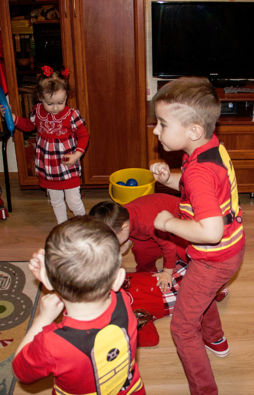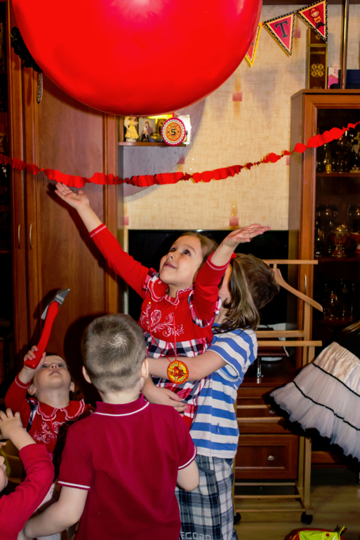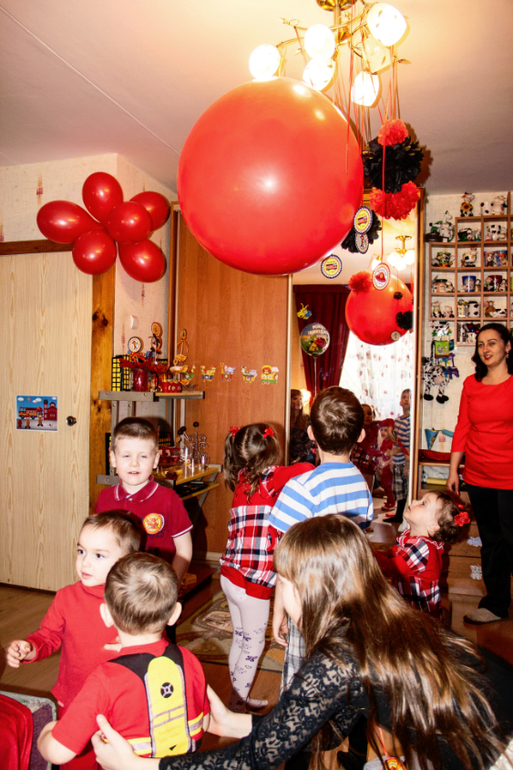 А потом пришла очередь шара-сюрприза... Сразу я его вывешивать не стала. Хоть он и легкий, но нарушал композицию на люстре, а куда его еще можно прикрепить в нашей комнате так и не придумала. Шар повесила, предпредила детей что это огонь и лопнула... А оттуда вылетело много маленьких "огоньков" которые надо срочно потушить... Что тут началось... Кто ногами, кто зубами, кто как пытались их лопнуть... Удавалось, но медленно... Шарики были неплотно надуты, чтобы маленького размера было легче просунуть в большой шар. Попробуй такие лопни с разбега... Но тут наши умные дети сообразили, что надо взять что-то острое. Алинка успела где то найти ножницы, а остальные брали кейкотоперы на зубочистках и острым концом быстренько полопали все шарики... Это тоже был фурор... Я прямо в душе порадовалась что не бросила это дело на полпути, а всё таки доделала этот шар-сюрприз... Что еще не только оформителем, кондитером, аниматором, но еще и воздушным дизайнером поработала... Но надо было как то потренироваться заранее... Хотя как? Заранее такое особо не надуешь, весь товарный вид потеряет... Но зато теперь есть опыт )))