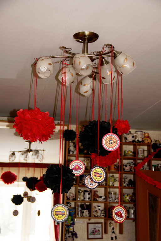 На люстру тоже повесила помпоны (красные и черные) и большие круги (такие же как и в оформление кендибара чтобы сочеталось). Получился такой интересный мобиль.