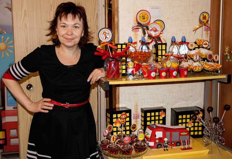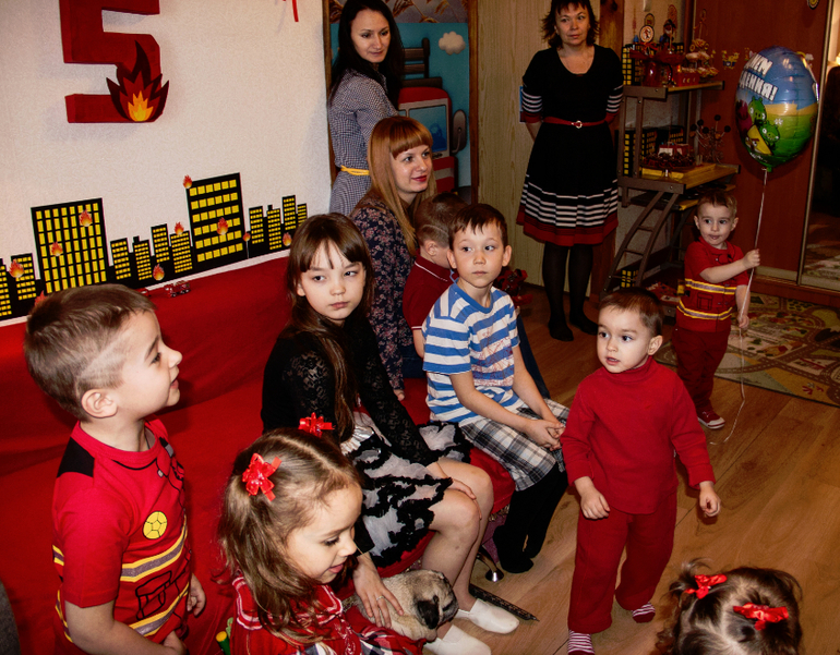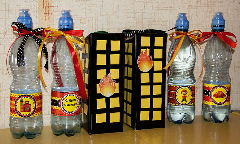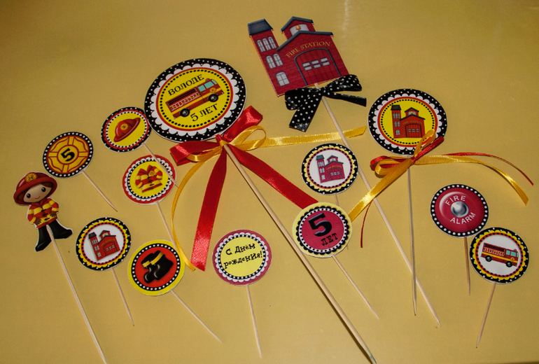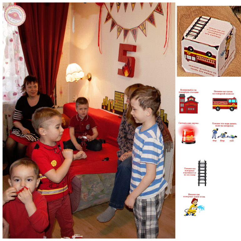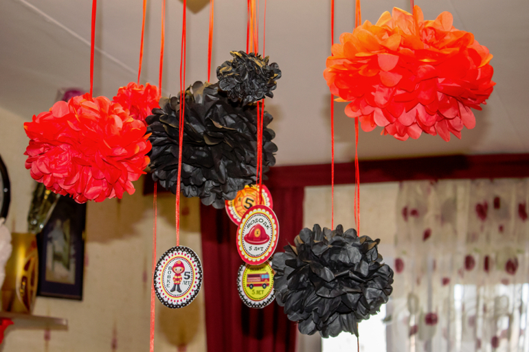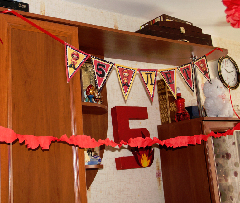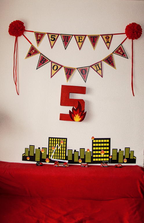 В оформлении использовала макеты горящих домов. Над диваном на самоклейке распечатала типа город - черные дома и желтые окна. На них дети наклеили огонь опять же на самоклейке (не ищите симметричность, огоньки клеили дети, я пыталась исправить, но не получилось). Около горящих домов на спинке дивана собрали какие нашли мелкие пожарные машинки, типа тушат огонь. Наверху повесили растяжку с парой красных помпонов и ниже цифру "пять". Хорошо каркас цифры еще с деревянной свадьбы был, а дети уже достаточно взрослые чтобы самим перекрасить в красный цвет. Я только помогала и потом огонь из фетра приделала...