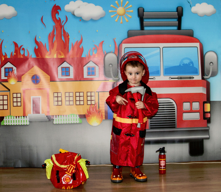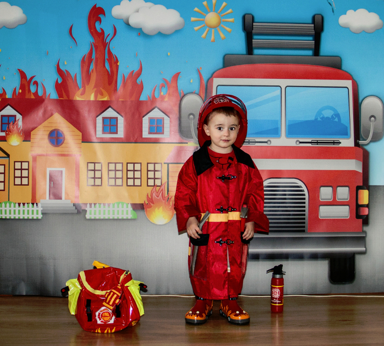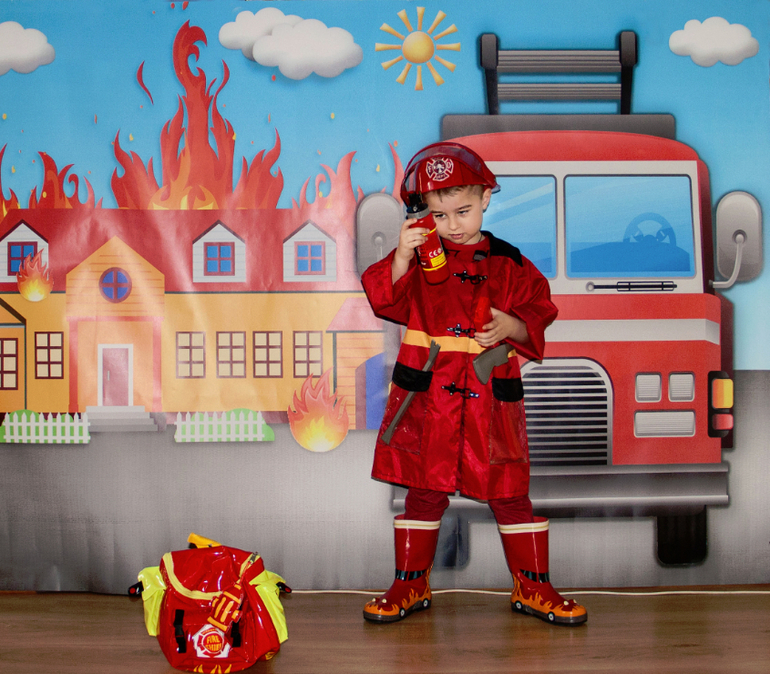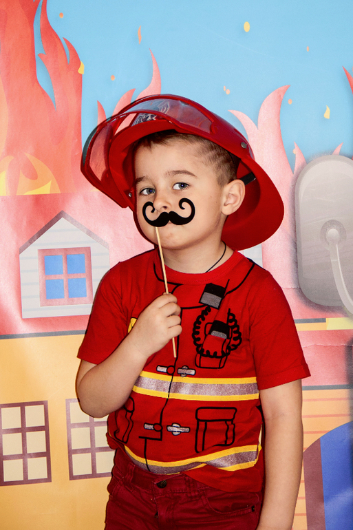 Еще была напечатана в типографии фотозона 1,5 м на 2 м чтобы дети на её фоне фотографировались... Типа горящий дом, пожарная машина, а дети сами пожарные должны тушить огонь. Но это же дети ))) До фотографирования и позирования дело толком и не дошло... Я ведь еще приготовила фотобутафорию - черные усы разной формы. Ведь настоящий пожарный обязательно должен быть с усами. Знаете почему? Из старины еще идёт, когда усы смачивали водой и они помогали дышать в дыму когда не изобрели противогазы. Я первый раз просмотрев фотографии даже расстроилась, зачем деньги на фотозону тратила? Но в целом фото на фотозоне очень красивые на мой взгляд.