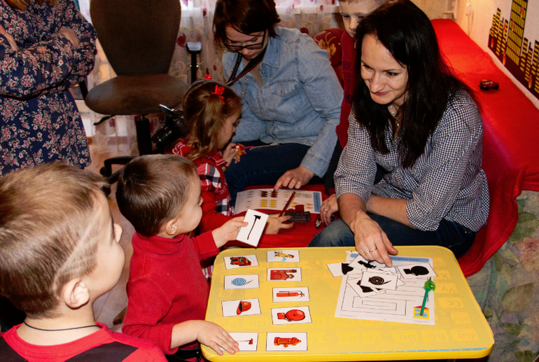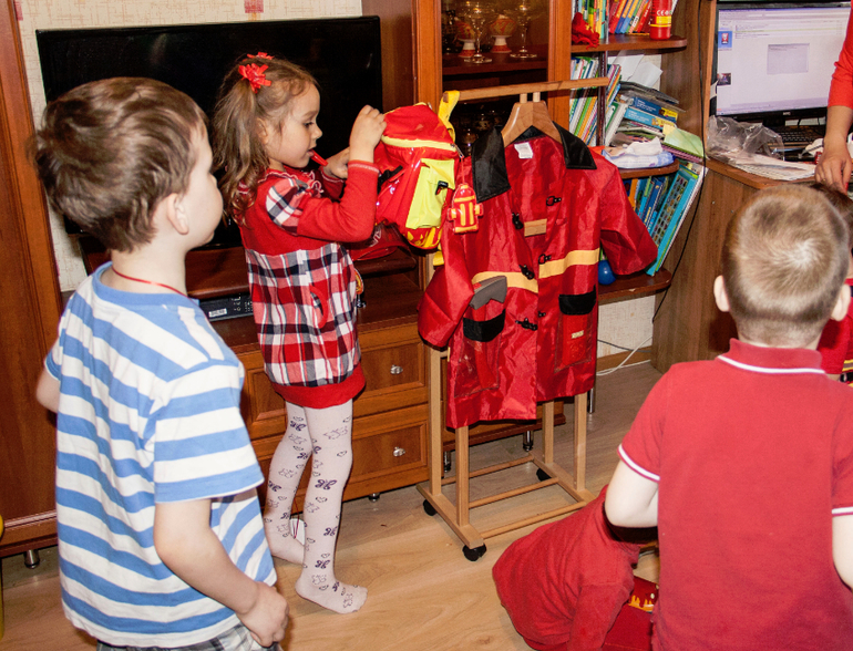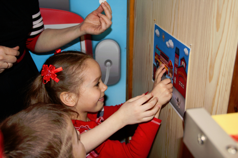 Потом поговорили о пожарных, что прежде чем выезжать на вызов им надо одеться в специальную форму. Было предложено помочь им одеться. Надо было с закрытыми глазами наклеить каску и плащ...