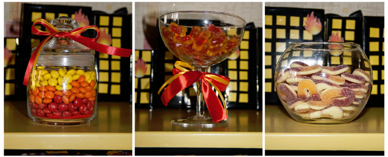 Для сладкого стола сделала опять макеты горящих черно-желтых домов. Купила пару метров самоклейки и оклеила ей несколько коробок разного размера. Думала делать разноуровневый стол и использовать дома как подставки... Но потом прикинув что места дома катастрофически мало, а подросшим детям надо место побегать, было решено расставить кендибар на компьютерном столике который у нас используется под игрушки. Там есть вверху полочка для принтера, выдвигается под клавиатуру, еще и под ноги есть... Так что стол сам получился многоуровневым, домики как подставки не пригодились, а просто использовались как оформление...