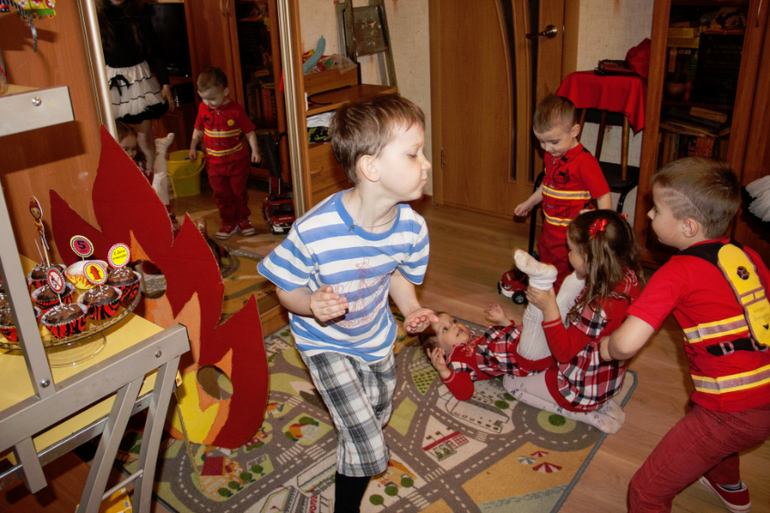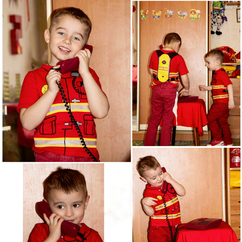 Поговорили с детками - огонь добрый или злой? Что нужно делать чтобы не было пожара? Тут конечно именинник развыступался с лекцией "Что спички (при нашей дикции очень похоже было на "письки" и папа каждый раз вздрагивал) детям брать нельзя.... Потом поговорили что делать если дома пожар и дым? Выяснили что лучше ползти по полу чтобы меньше дышать дымом к телефону и вызвать пожарных. Детям было дано задание проползти, правильно набрать номер "01" и вызвать пожарных назвав свой адрес. А что? Моделирование экстренной ситуации никогда не вредило.... Тут конечно я опять сплоховала, было задумано что дети должны были ползти под тонким черным пледом символизирующим дым, который... но я не смогла его найти... давно убрала, когда Павлика перестала снимать в стиле Адель Энерсон. Просто ползти детям было думаю не так неинтересно, но с заданием справились... Даже двухлеткам интересно было поиграть в телефон...