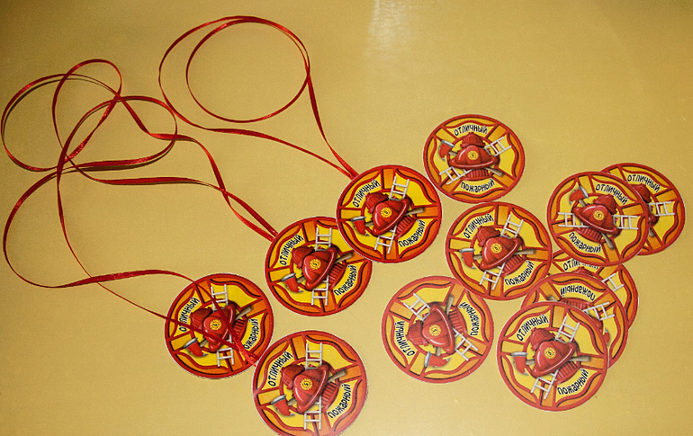 Затем прошедшим испытания вручили медали "Отличный пожарный". Девочкам приготовила на ленточке, а мальчикам на самоклейке чтобы можно было как значок прямо на одежду цеплять.