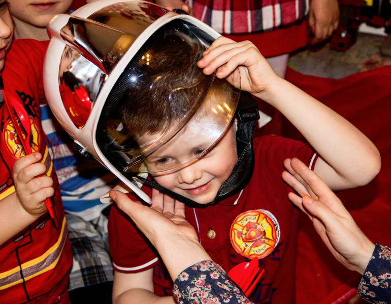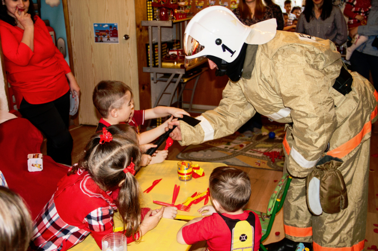 Это дедушка в спецодежде пришел поздравить внука. Он показал всем костюм, дал потрогать пожарный топор и померить настоящую каску