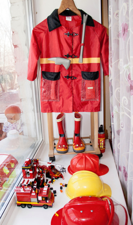На подоконнике за занавеской была припрятана форма пожарного с касками, инструментами и сапогами для конкурсов и фотографирования.