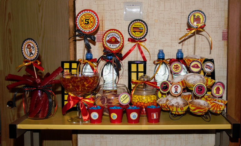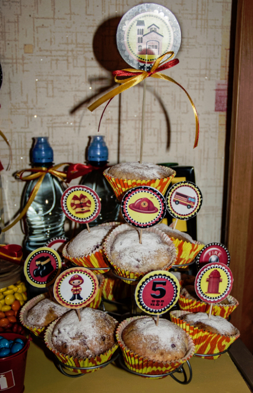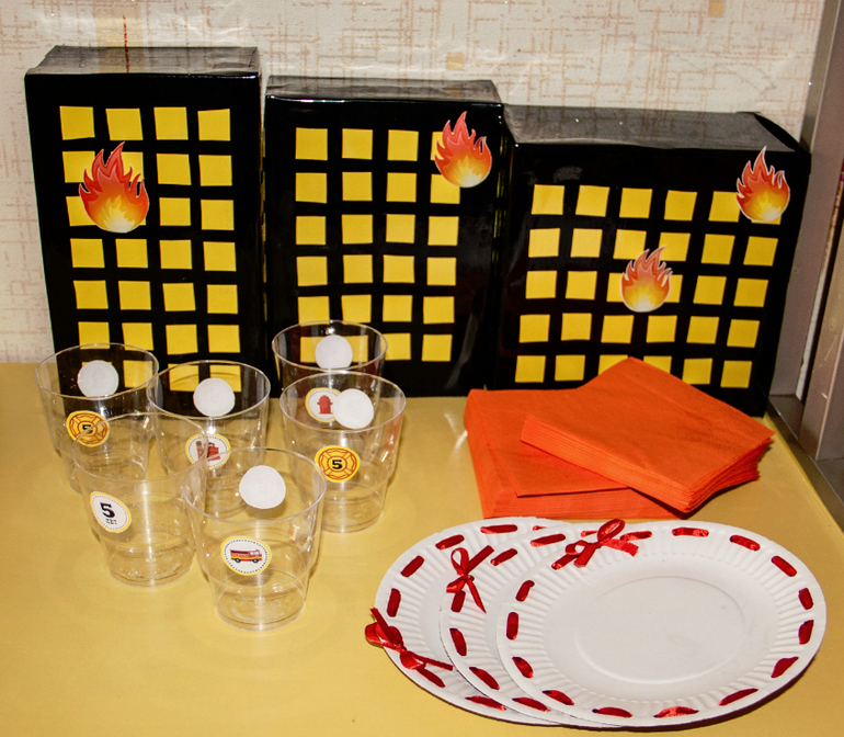 Для сервировки стола у нас ничего не нашла по пожарной теме. Да мне что-то в последнее время не очень и нравится стала чересчур яркая сервировка одноразовой посуды для детских ДР. Поэтому я как и в том году просто купила однотонную желтую скатерть (не пригодилась), одноразовые бумажные тарелки украсила красными лентами, одноразовые прозрачные стаканчики украсила наклейками как кейкотоперы.