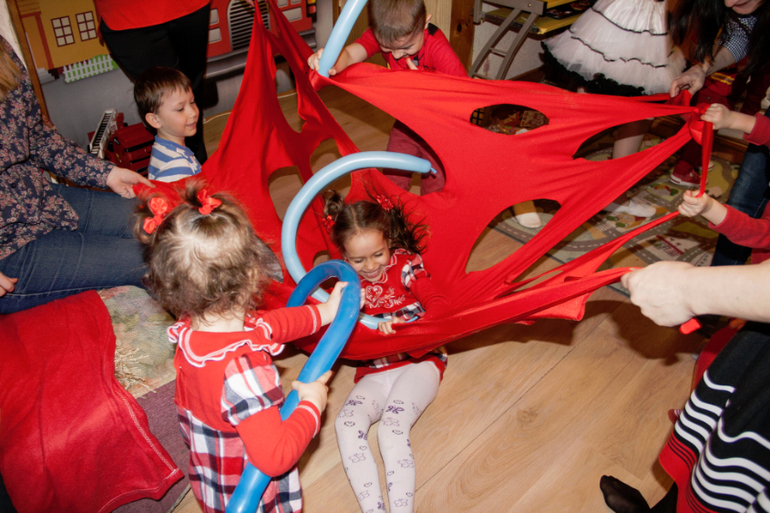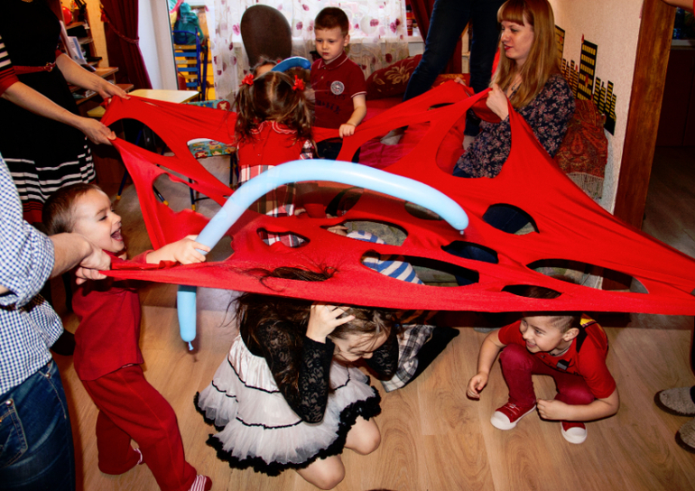 Ну а дальше был хит... Мне уже когда Лена на ДР сына нанимала аниматора понравился этот конкурс - пролезть через эластичную ткань вдоль и поперёк... Не зря я на сайтах аниматоров искала как называется подобная ткань (оказывается бифлекс), как сделать паутину из неё, где купить в магазине и пришлось заказать через интернет в Москве специально красного цвета (огонь же)... Потом сама вырезала дырки. Из остатков сшила собачке костюм... Детям ооочень понравилось. Сразу все подключились, было очень весело... Кстати, по отзывам даже у взрослых это идет на ура... Могу теперь по Владимиру сдавать в аренду на праздники чтобы затраты немного откупить...