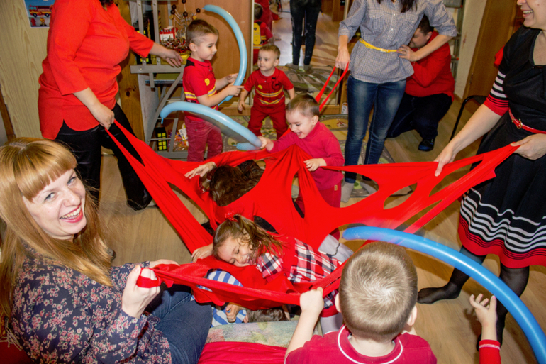 А потом придумала еще конкурс с данной тканью. Надула три голубых длинный тонких шарика, типа вода. Их вручила детям в роли пожарных. А остальные были огоньками. Они сидели внизу под горизонтально натянутой тканью, а когда выглядывали в дыры пожарные шариками должны были их тушить. Если коснулся шарик-вода, огонёк должен опять спуститься вниз в дырку, чтобы потом опять выглядывать... Ну язычки пламени ведь тоже бывает выглядывают уже на потушившем месте )))