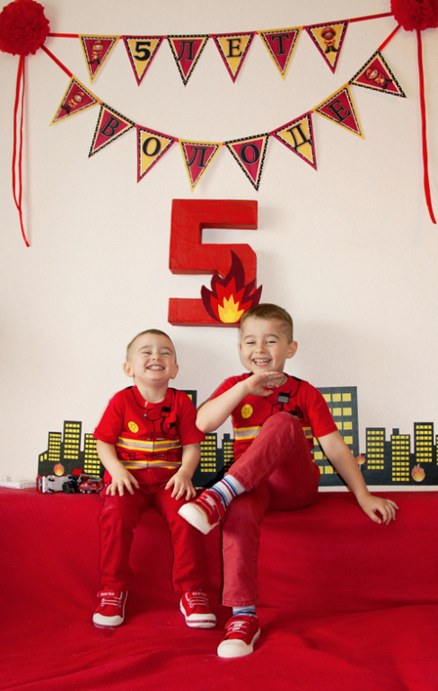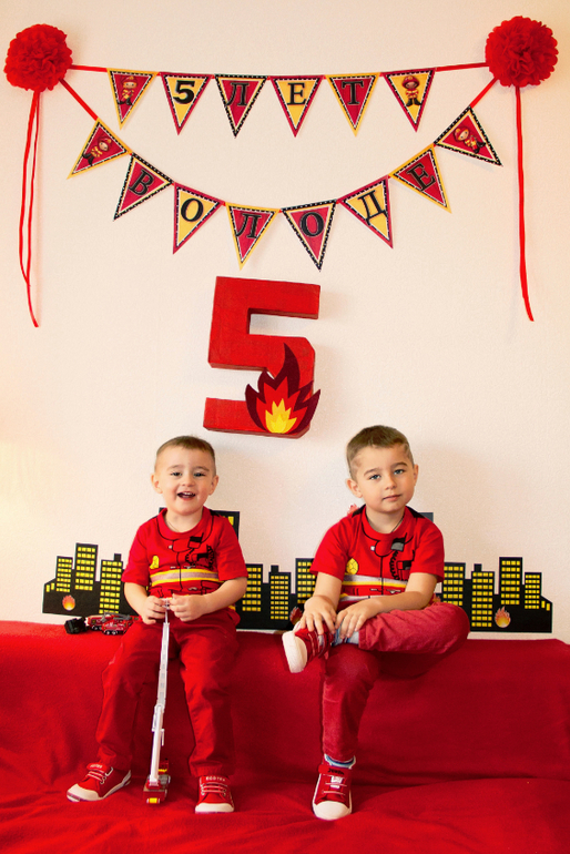 Приглашения, растяжки, кейкотоперы и прочее сделала в электронном виде за месяц, отдала в печать и уехала в Беларусь. Вернулась за неделю до ДР и понеслась основная подготовка.... Хорошо футболки как пожарная форма и красные кроссовки сыночкам заранее заказала, а красные штаны при моей любви к этому цвету у них в гардеробе есть...