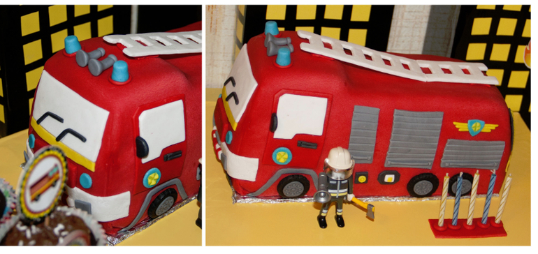 А вот и сам торт... Вовка так давно просил испечь ему большой торт в виде пожарной машины, а я всё кексами в формочках в виде машинки отделывалась... Но тут уж размахнулась... Первый раз собирала в прямоугольный колодец. Внутри шоколад на кипятке и творожный крем с персиками. Хотелось полегче для детей, и итак выравнивала маслянно- печеньечным кремом...В принципе, могу гордится тортом... Это третий по счёту с мастикой... Достаточно аккуратно... Жалко что сзади не сфотографировали, там тоже интересные детали были, шланг... Мужа напрягла рисовать чертеж в трех проекциях на компе чтобы вырезать и собирать детали легче было...
