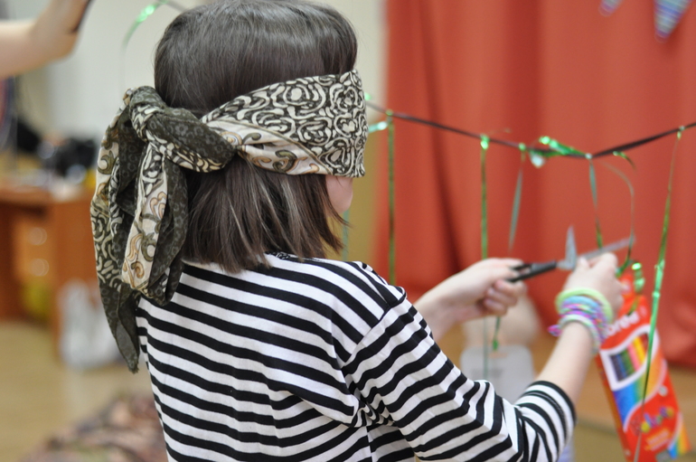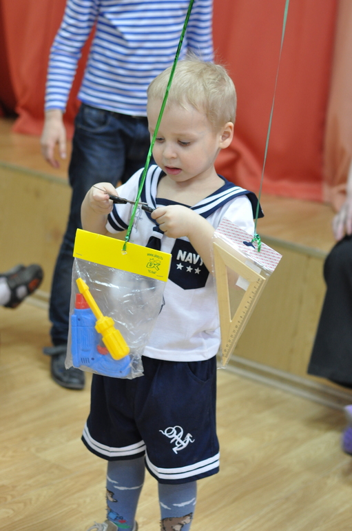 На ниточку развешиваются различные подарки. Ребёнку завязывают глазки, подводят к ниточке, какой подарок он отрежет ножницами, тот и получает.Но так как у нас детки были маленькие мы им глазки не завязывали, что им понравилось, то и они и отрезали. А большим глаза завязывали (участвовали тети, дяди, бабушки). Всем этот конкурс понравился, пришлось второй раз подарки на ниточку привязвать.