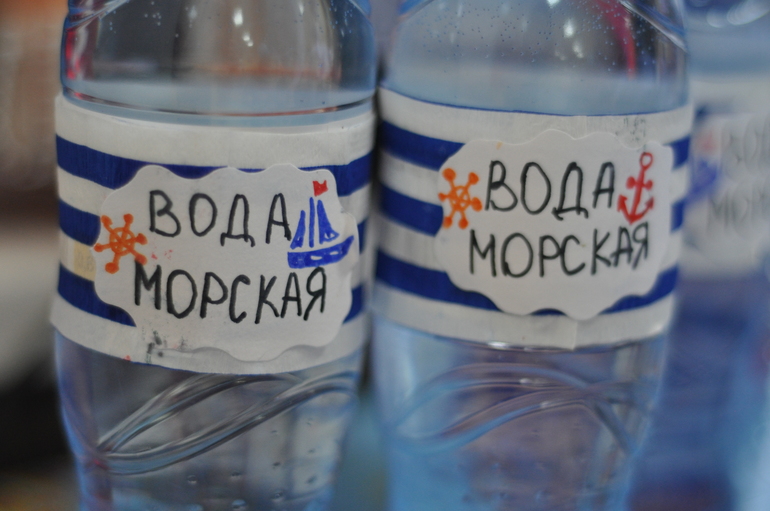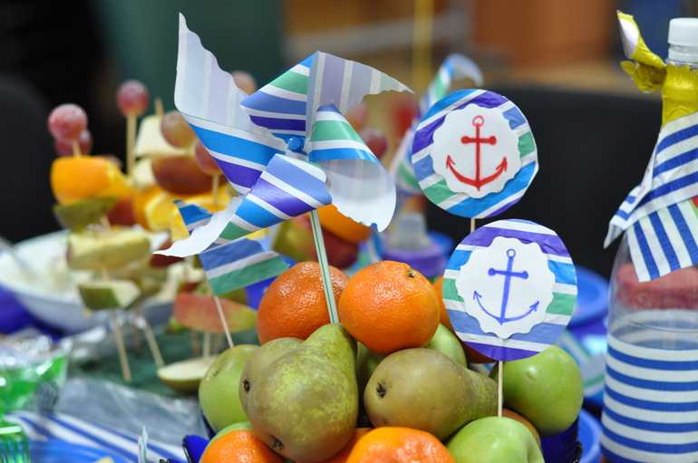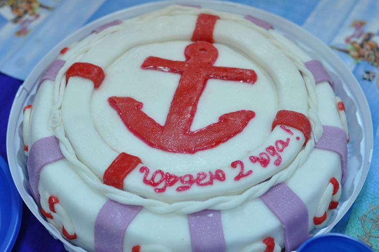 Якорь покрасила в красный цвет, а штурвал в оранжевый. Все вырезано из картона