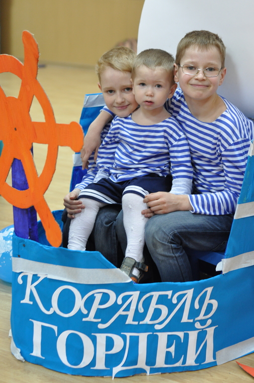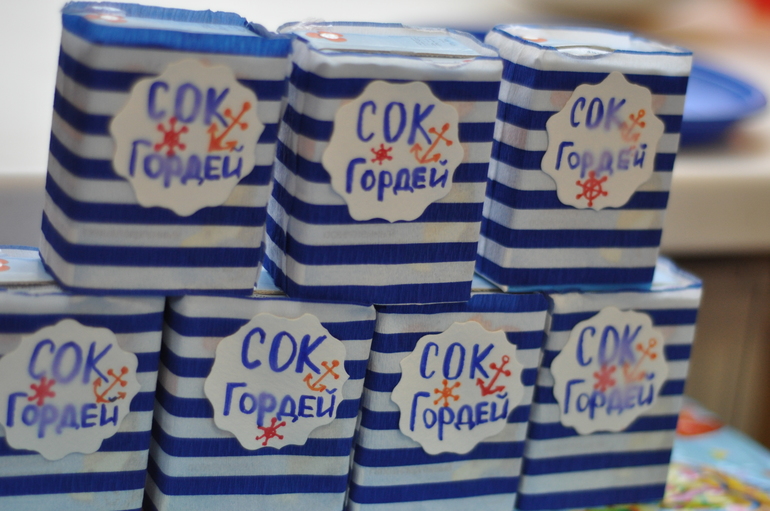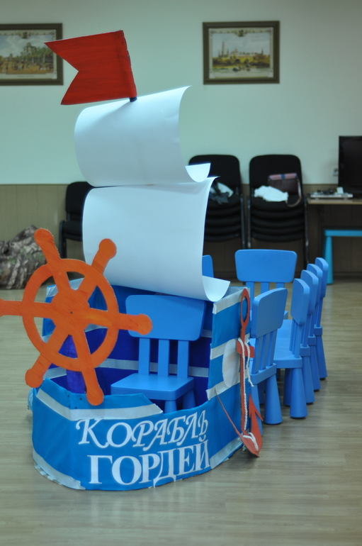 Корабль называется "ГОРДЕЙ", сдалала сама из картона и обклеила из гофры и малярным скотчем сделали полосочки. Из упаковочной бумаги взяла две трубы, покрасили в черный цвет и повесили красный флажок