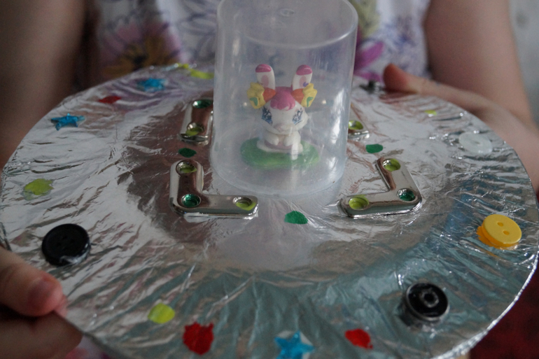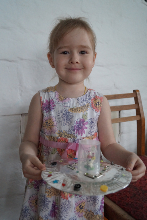 После решили смастерить летающую тарелку, ведь еще и день космонавтики. За день до этого Полина в первый раз увидела инопланетянина, правда ненастоящего, а надувного на крыше магазина бытовой техники. Восторга было уйма.