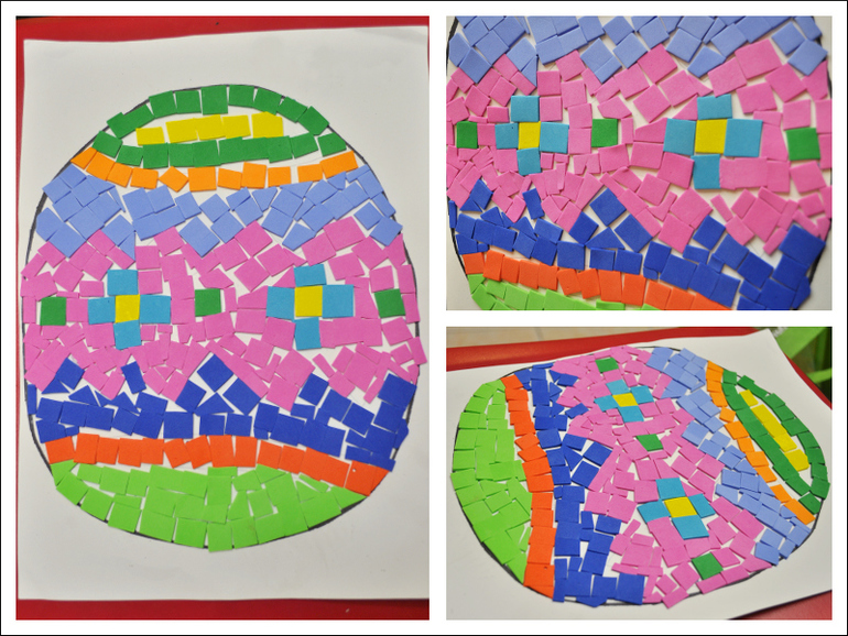 Нарезала я сыну разноцветных квадратиков из пенки, выдала клей и показала, как клеить. Хорошо, что я была чем-то другим занята, а то поначалу очень подмывало показывать да подправлять работу сына, поэтому нижняя часть яйца так плотно обклеена мозаикой. А на поверку оказалось, что лучше выглядит как раз та часть, которую делал сын самостоятельно - там, где элементы мозаики не плотно прилегают друг к другу.