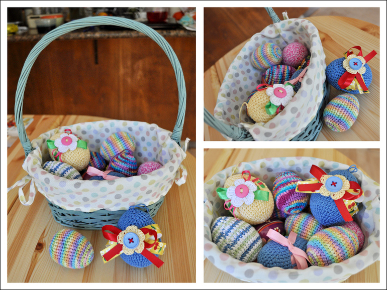 Но идею пасхальной игры с сыном я всё же не забросила и навязала для этого разноцветных яиц (обвязывала крючком пенопластовые яйца вот ). В день Пасхи сын разыскивал разноцветные яички по всему нашему двору, а потом обменивал их на шоколадные монетки или на домашние маффины.