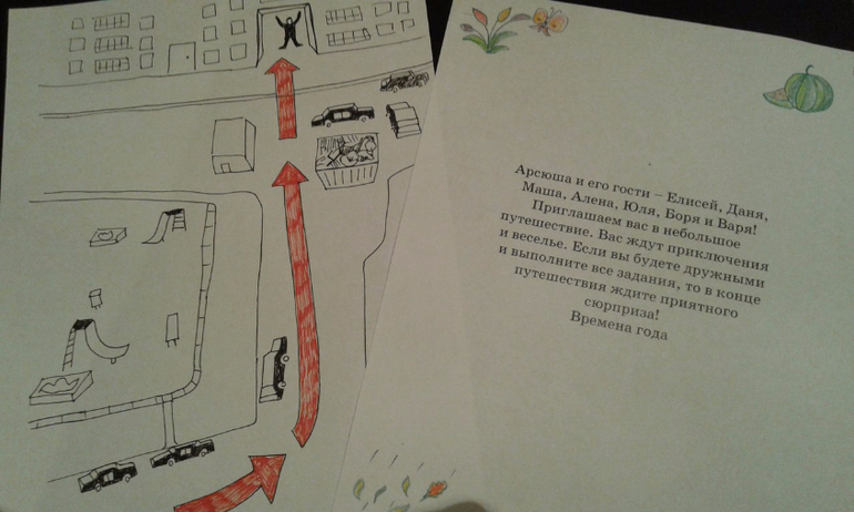 Собрались мы в фойе нашего дома и консъержка вручила письмо и красный шарик! Я загадала загадку про лето. С него мы и начали.В письме была карта...
