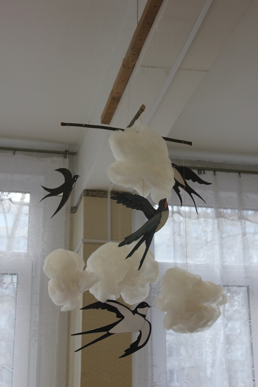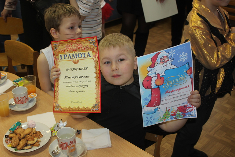 После спектакля было чаепитие... На котором попутно вручали грамоты. У нас их две. Причем мы одни такие... Одна, которая с дедом Морозом (это был районный конкурс, а так как у нас все делается долго, то грамоту мы получили сейчас). А вторая грамота: мы стали победителями конкурса на весеннюю тематику... Помните наших ласточек в облаках....