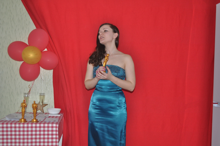 4. На сайте www.cool-editor.ru сделала шуточные видео с участием каждого гостя. У меня были придуманы номинации ("Актриса года", "Актер года", "Лучший грим", "Солист года", "Супергерой" и т.д), согласно которым каждый гость после показа ролика получал свой долгожданный Оскар! Каждую номинацию распечатала на принтере и приклеила на отдельный конверт, в котором лежала карточка с именем гостя. После просмотра ролика, из конверта доставалась карточка с именем и вручался Оскар))