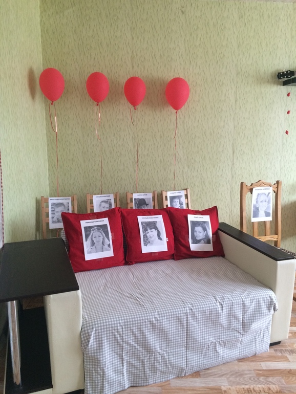9. Заранее распечатала фотографии гостей на листе А4 и наклеила на места в "зрительном зале". Кстати импровизированный красный занавес я сделала и икеевского покрывала на кровать, которое как раз оказалось нужного цвета)))