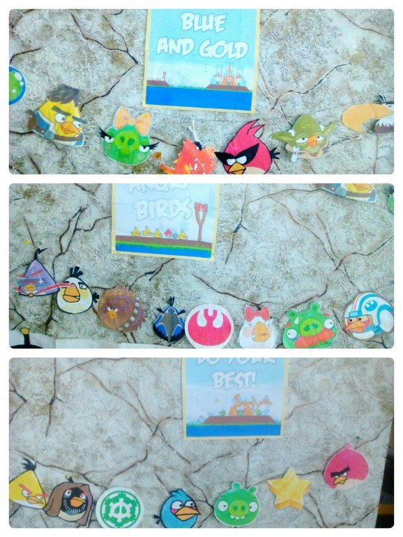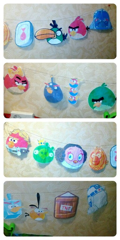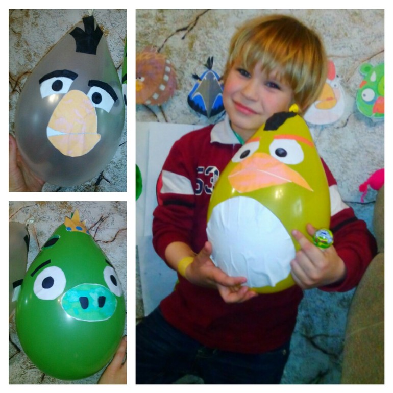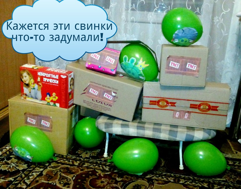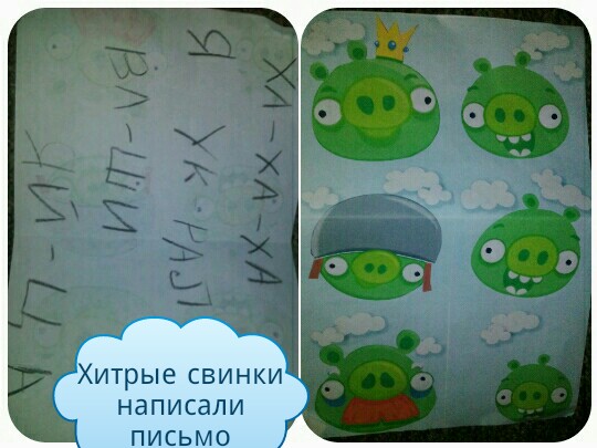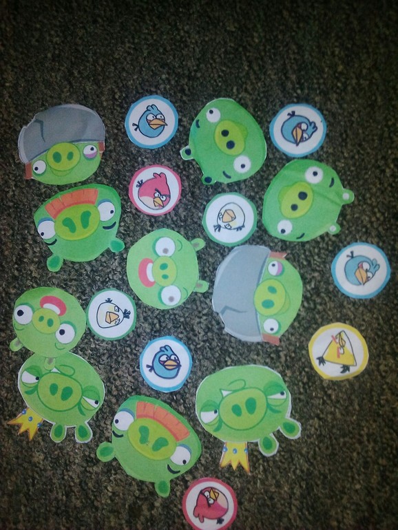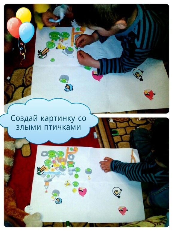 Придумать картину с участием птиц и свиней. На всех детальках сзади был наклеен двусторонний скотч, для удобства создания картинки.