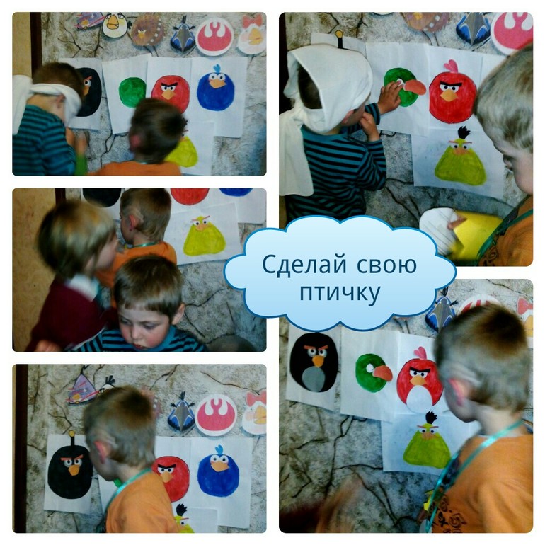 Сделать птичку. Предполагалось, что с завязанными глазами клеить будут, но оказалось, что просто так им делать картинку интереснее.