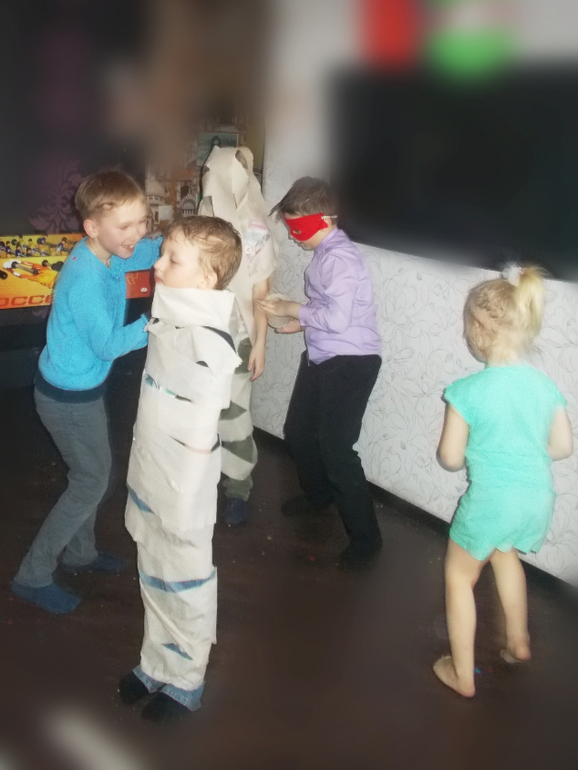 ААА,дети любят игру мумия,туалетной бумагой обмотать кто лучше,мусора было много,но весело