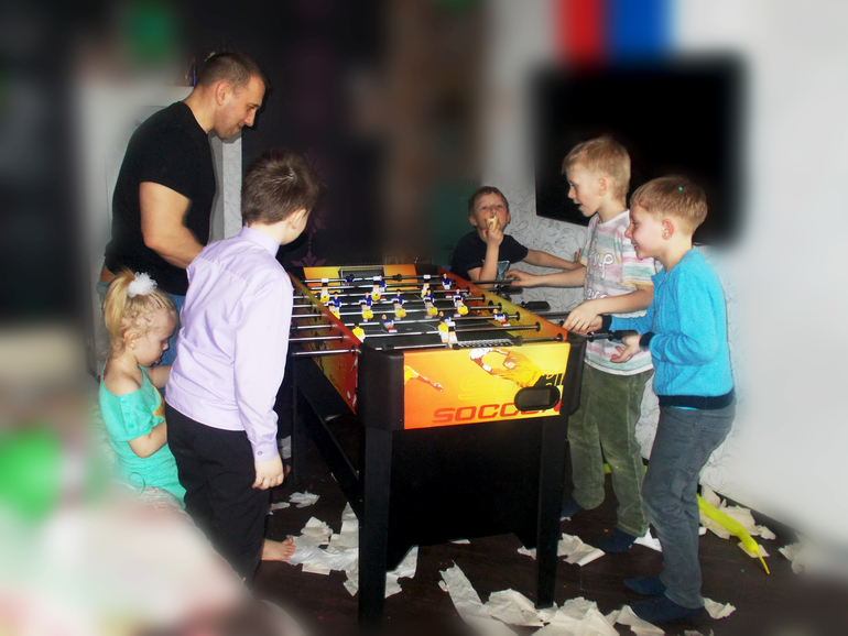 в подарок Максим получил большой футбольный стол,блин,он огромный,но вещь клевая,теперь устриваем матчи,а пока ждали всех гостей детвора играла,можно как вдвоем ,так и в 4-ом,6-ом.