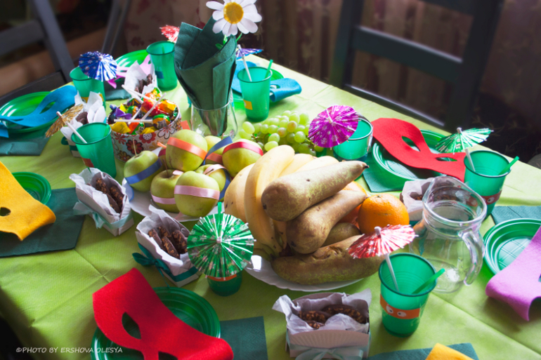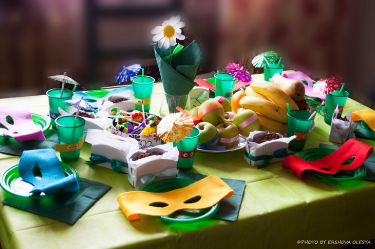 себе с мужем накрыли скромно стол на барной стойке,сидеть особо не приходилось=))Взрослых не приглашали,т.к. праздник детей и всё внимание хотелось подарить им.