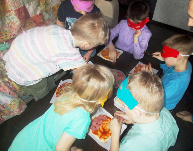 делала бумажную пиццу и попадали с расстояния в ведро,типа кормили черепашке пиццой,а после всех надо было ей накормить и мы делали пиццу сами,деткам оооочень эта идея понравилась