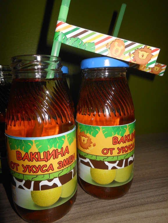 Понадобятся кокос и пластиковые бутылки, наполненные водой. На бутылки я приклеить этикетки с изображениями животных: на пяти бутылках изображены обезьяны, на двух - слоны, еще на двух - тигры и на одной - лев. За обезьян дается 1 очко, за слонов - 3, за тигров - по 5, а за льва - 10. Конкурс больше всего понравился имениннику)))