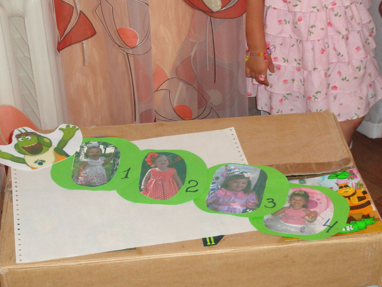 Лунтик: Мы его вчера вместе с Кузей положили в эту коробку и отнесли в надежное место! А сегодня его там нет! Смотрите, зато здесь на дне коробки какие-то кружочки и письмо. Катя, ты поможешь нам собрать их от 1 до 6(на кружочках фото Кати с рождения, 1 года, 2,3 и 4 лет и голова Вупсеня)