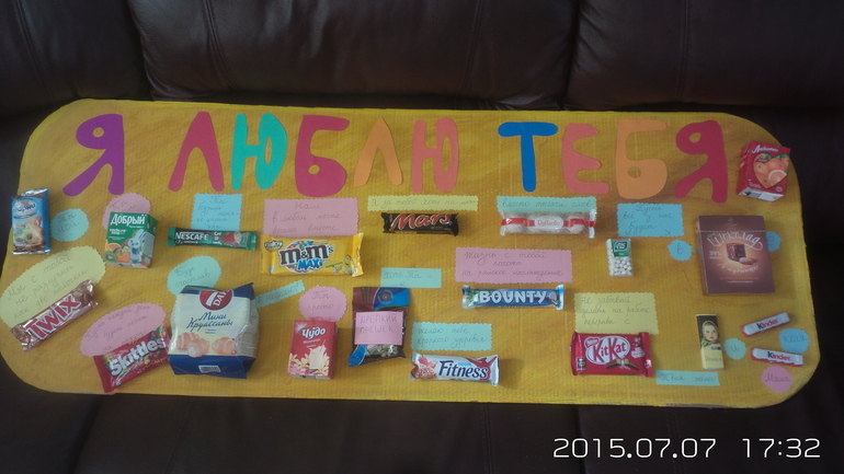 Денег особо не было, поэтому придумала вот такой подарочек! Своими руками! Идея не моя, не нова, но мне показалась очень интересной. Мужу очень понравилось. Он и фотографировал, и смеялся и умилялся. Но к сладостям не притронулся, жалко, говорит.