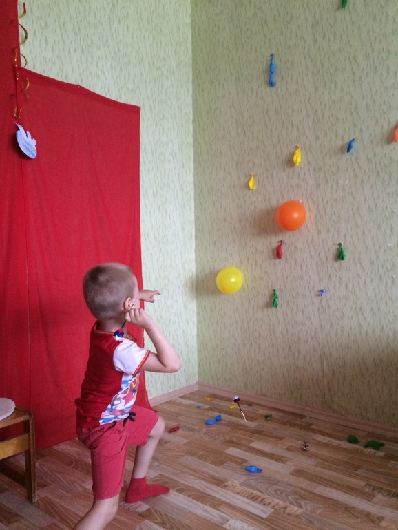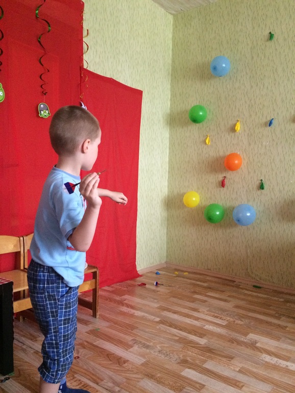 Но самая главная моя гордость - это развлечение, которое я придумала. Сначала я хотела сделать что-то, чтобы можно было стрелять из рогатки, но потом мне в голову пришла идея стрельбы из дротиков по надувным шарам. А в шариках был сюрприз - нарисованная монетка с разным номиналом.