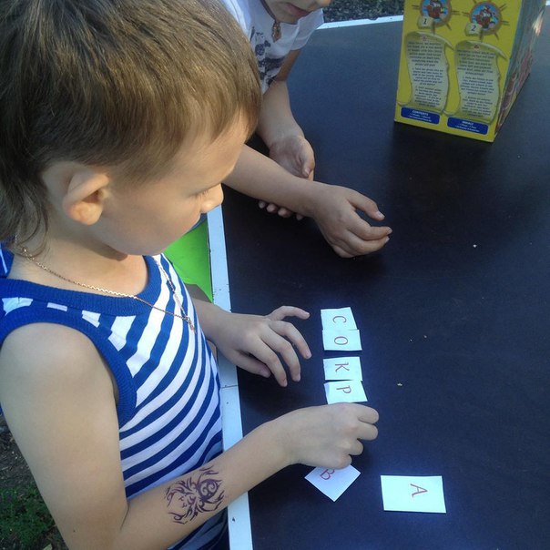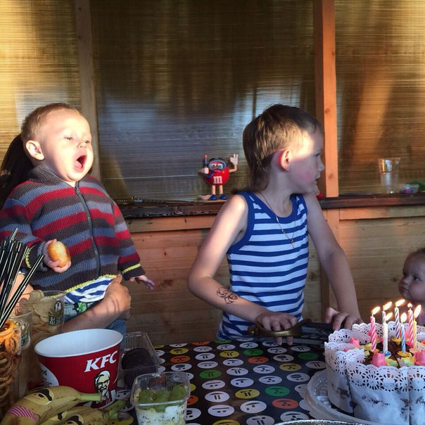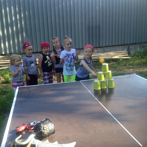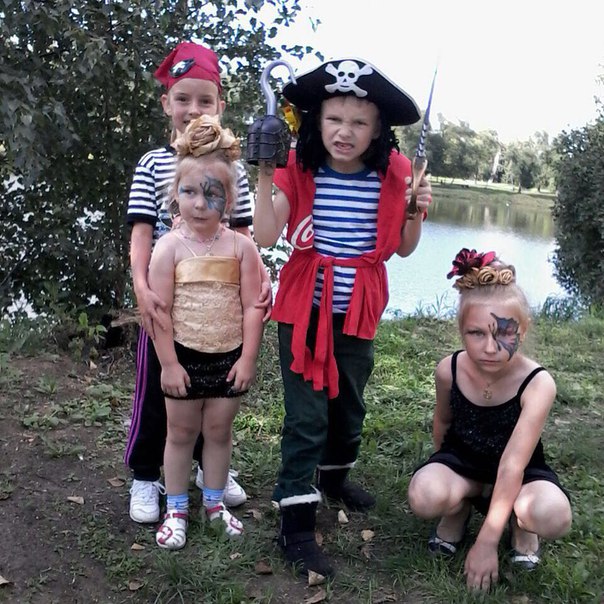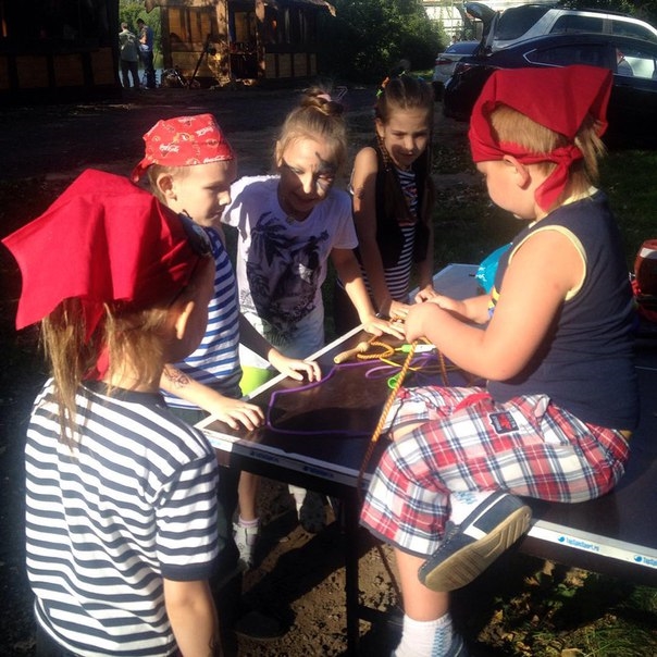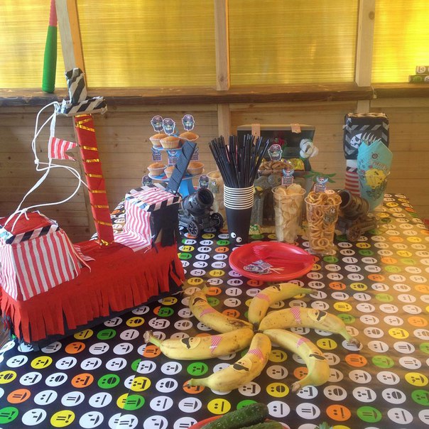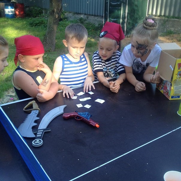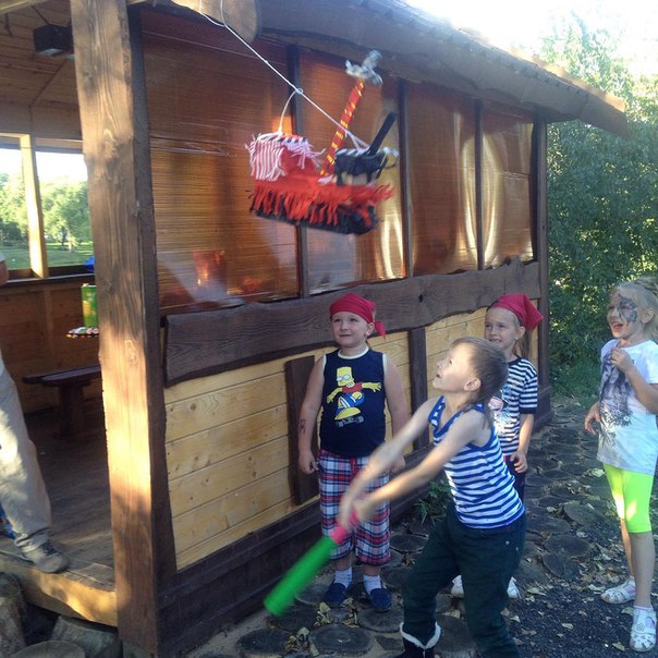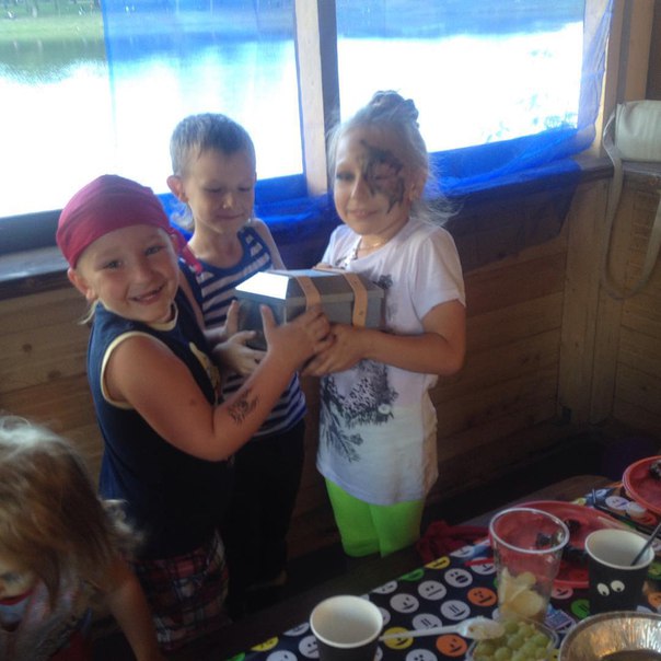 День рождение отмечали на природе, детки хорошо повеселились, всей командой сначала добывали буквы для секретного слово, а потом и сам сундук с сокровищами. В конце разбили пиньяту с конфетами и забили ими карманы :))