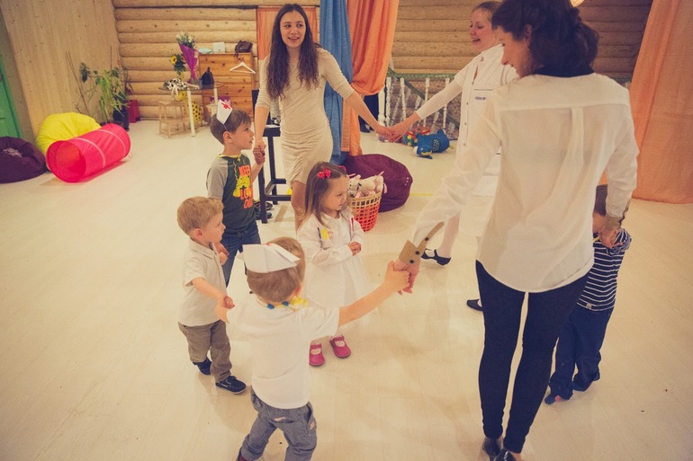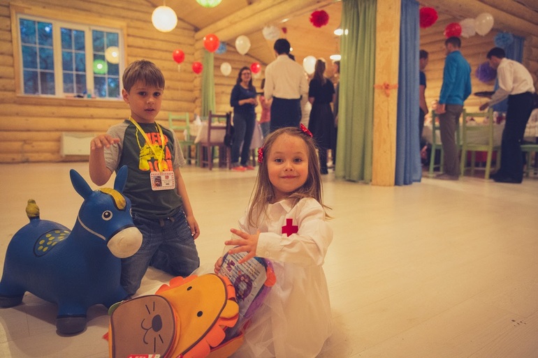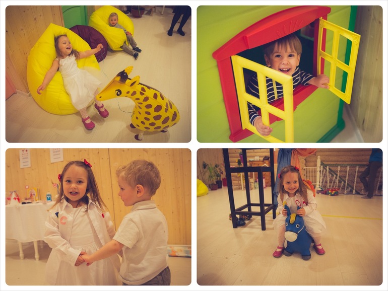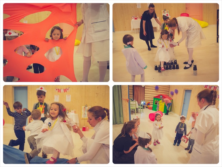 Пока гости собирались дети развлекались на мягких подушках, в "Аптеке", лечили друг друга и скакали на помощь к больным зверюшкам)