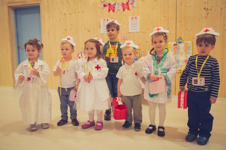 Халат я сделала из рубашки для мальчиков на 2 размера больше, пришила из фетра крестик и надпись Doc. Всем деткам из бумаги я сделала шапочки доктора и у каждого именной бейдж. Пригласительные сделаны в виде докторского кейс (на фото у мальчика слева и девочки справа), в котором кроме приглашения детки получили фонендоскоп, сшитый из фетра и ободка для волос (у мальчика слева на фото).