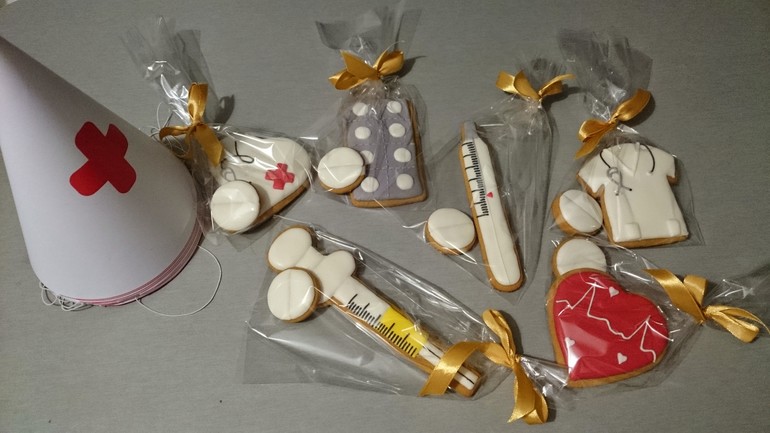 Торт был тоже в тему с фонендоскопом, термометром, таблетками и пластырем