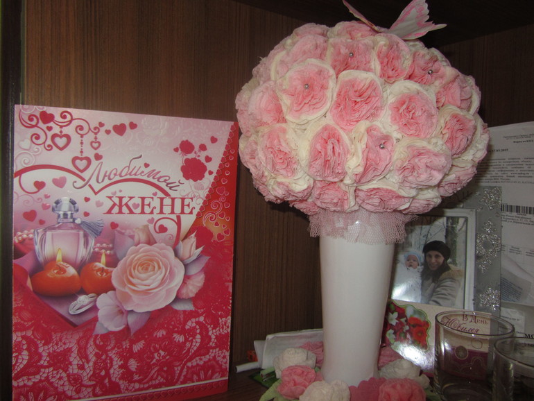 Нарядила манекен в своё свадебное платье! Гости удивились что я сохранила платье. На этом фото видно, ну и украсила стену салфеточными цветами)