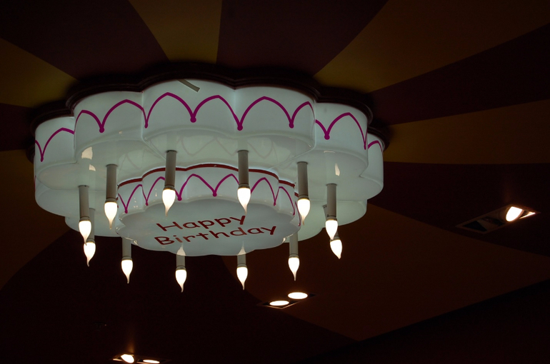 И немного антуража. Все как положено в Hamleys - яркие цвета, трон для именинника, и непременно большая люстра в виде торта и везде мииишки.