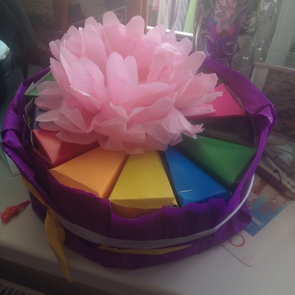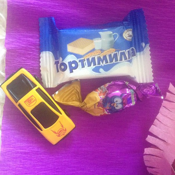 Плюсом еще два больших сока! Дочь с энтузиазмом помогала делать, и складывать угощение внутрь.... заранее озвучила какие кусочки ее друзьям достанутся и какой ей. А потом гордо вносила в группу. Так что импровизацией я довольна....можно было аккуратней но сделать ну как вышло))) Супруг отнесся с критикой считай киндер лучше.....и кусочки у меня не очень ровные. Но в конце когда завернули...изрек ничего так получилось