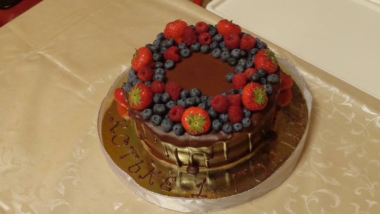 Вот такой тортик украшал наш стол. Приготовила его нам девушка из Красногорска. У нее очень приятные расценки 800-1000 за кг. Зависит от начинки. Если кому-то надо, дам контакт её.