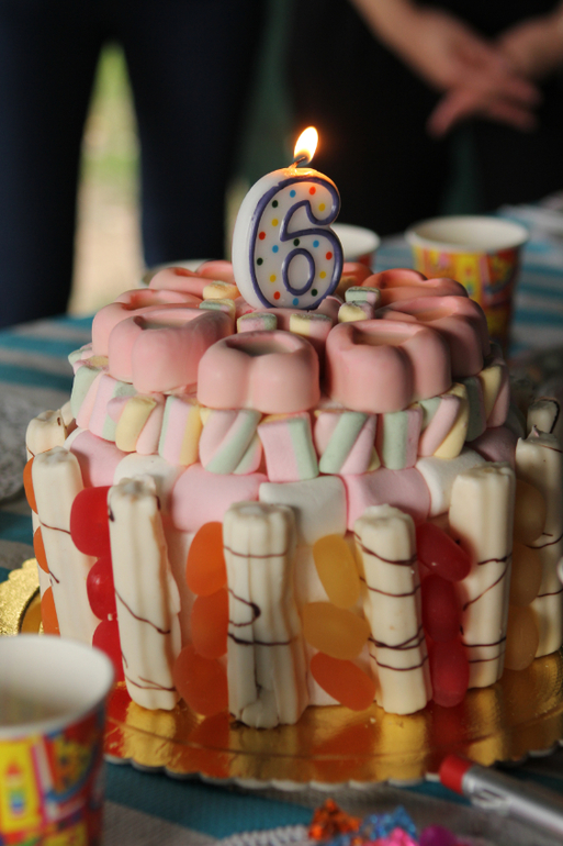 Итак, у нас получилось барбекю на природе. Если с шашлыками было все понятно, то, что делать с тортом, который должен весь день пробыть без холодильника пришлось подумать. В итоге, вспомнила, а точнее поняла, что придется делать самой, фальшивый «торт», так в Италии оформляют сладости на детских праздниках, и у меня оттуда было 2 пенопластовых круга, в которые втыкаешь зубочистки, а потом на них насаживаешь зефирки и мармеладки. В итоге, торт у нас получился вот такой: