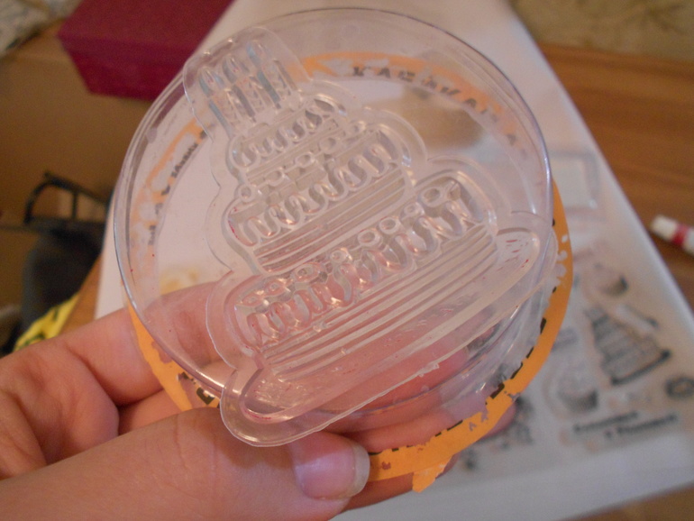 Отделяем штамп от основы и прикладываем к прозрачной пластиковой коробочке (она по возможность должна быть гладкая)