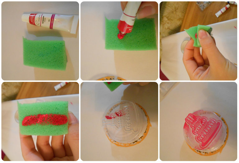Далее совсем просто: выдавливаем красочку на губку, и губкой наносим краску на штамп