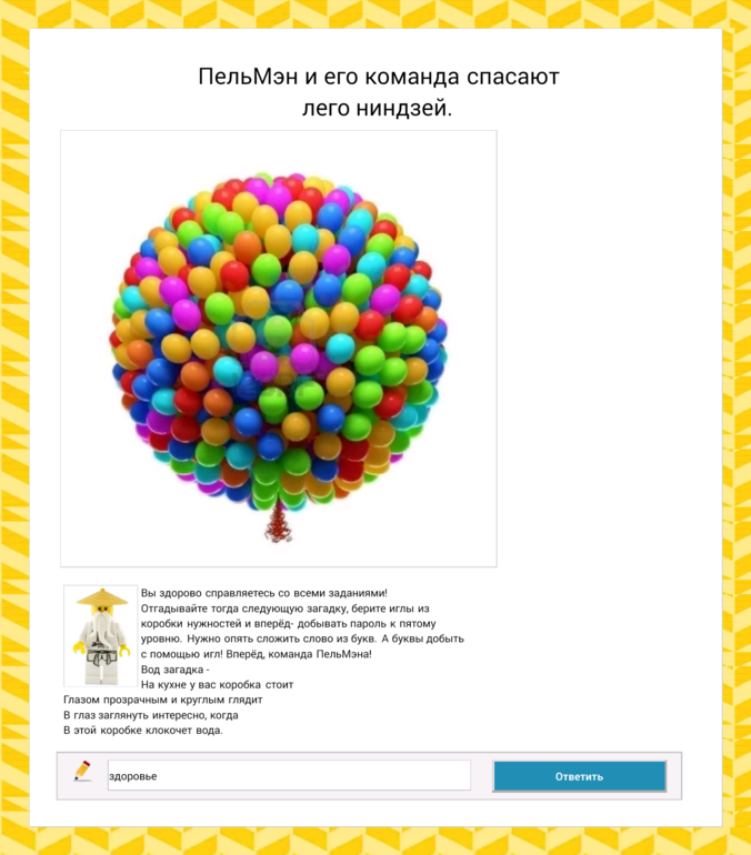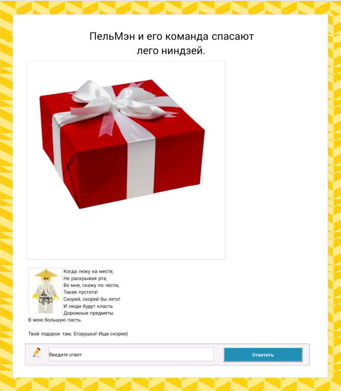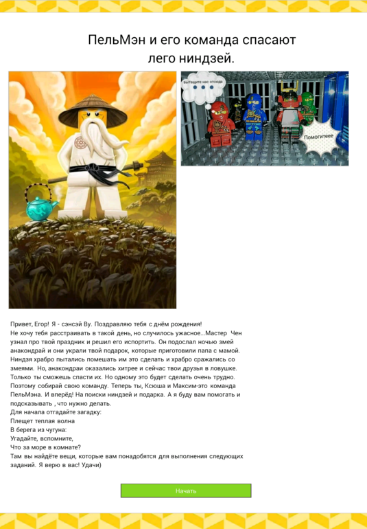 Егор фанатеет от лего-ниндзя, а его домашнее имя Егорка-пельмешек (за огромную любовь к пельменям. Отсюда и идея квеста. Супер-герой ПельМэн (он же Егорка ) должен найти своих друзей ниндзя, которые попали в ловушку, пытаясь спасти подарок на день рождения, который похитили коварные змеи анакондраи, посланные мастером Ченом.