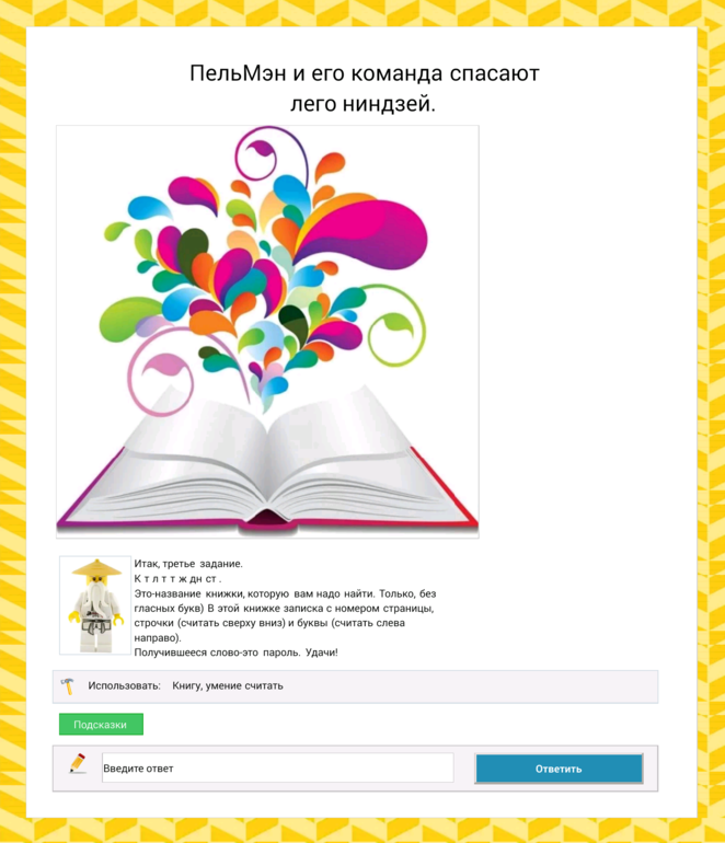 Нужно было расшифровать название книги, которое я напечатала без гласных, найти её и по подсказке с номером страницы, строчки и буквы, составить слово-пароль.